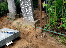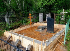 Вкопанные ранее сваи послужили великолепной основой для металлического каркаса, который мы и сварили прямо на территории места захоронения. Каркас был установлен по периметру участка с целью придать дополнительную жёсткость опалубке.