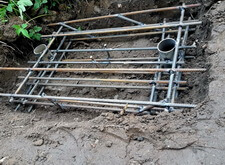 Далее мы приступили к изготовлению надёжного каркаса для массивной гранитной плиты. Взяв привезённые заранее сваи, мы вырыли относительно глубокую яму, и забили металлические трубы с двух сторон по её краям. Они и послужат двумя главными опорными точками для металлического каркаса, который мы тут же сварили из арматуры.