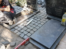 Переходим к завершающему этапу работы. Переустанавливаем уже стоящий памятник, немного его приподнимая, и закладываем территорию участка гранитной брусчаткой.
