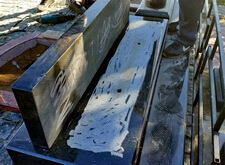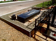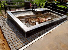 Когда работа с основанием практически завершена, переходим к следующему этапу – укладке гранитной брусчатки по периметру места захоронения. Во это же время покрываем гранитными плитами и залитый бетоном верх каркаса