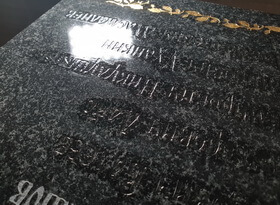 Далее снова повторяется процедура зачистки, на фотографии ниже показан конечный результат – готовая табличка, на которой нет ни следа лишнего. Каждая буковка аккуратно обработана и зачищена, на полированной поверхности гранита нет ни царапинки.