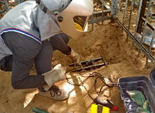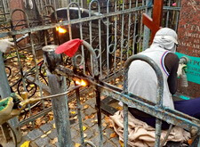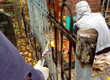 Обжигаем ограждение, параллельно с этим наносим на надгробье новую надпись.